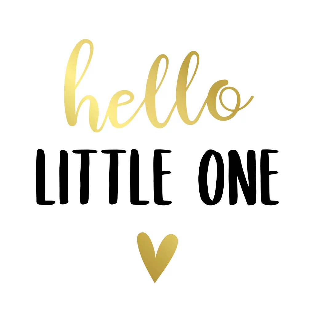 Hippe sluitsticker met goudfolie hartje en de tekst 'hello little one'. Pas de sticker naar wens aan met de editor.