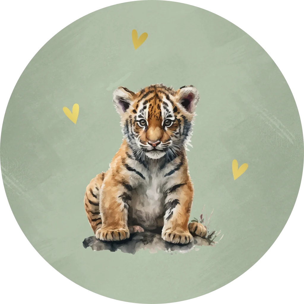 Leuke sluitsticker met groene achtergrond, lief tijgertje en goudfolie hartjes. Pas deze sticker naar eigen wens aan in onze handige editor. Deze sluitzegel past perfect bij dit geboortekaartje.