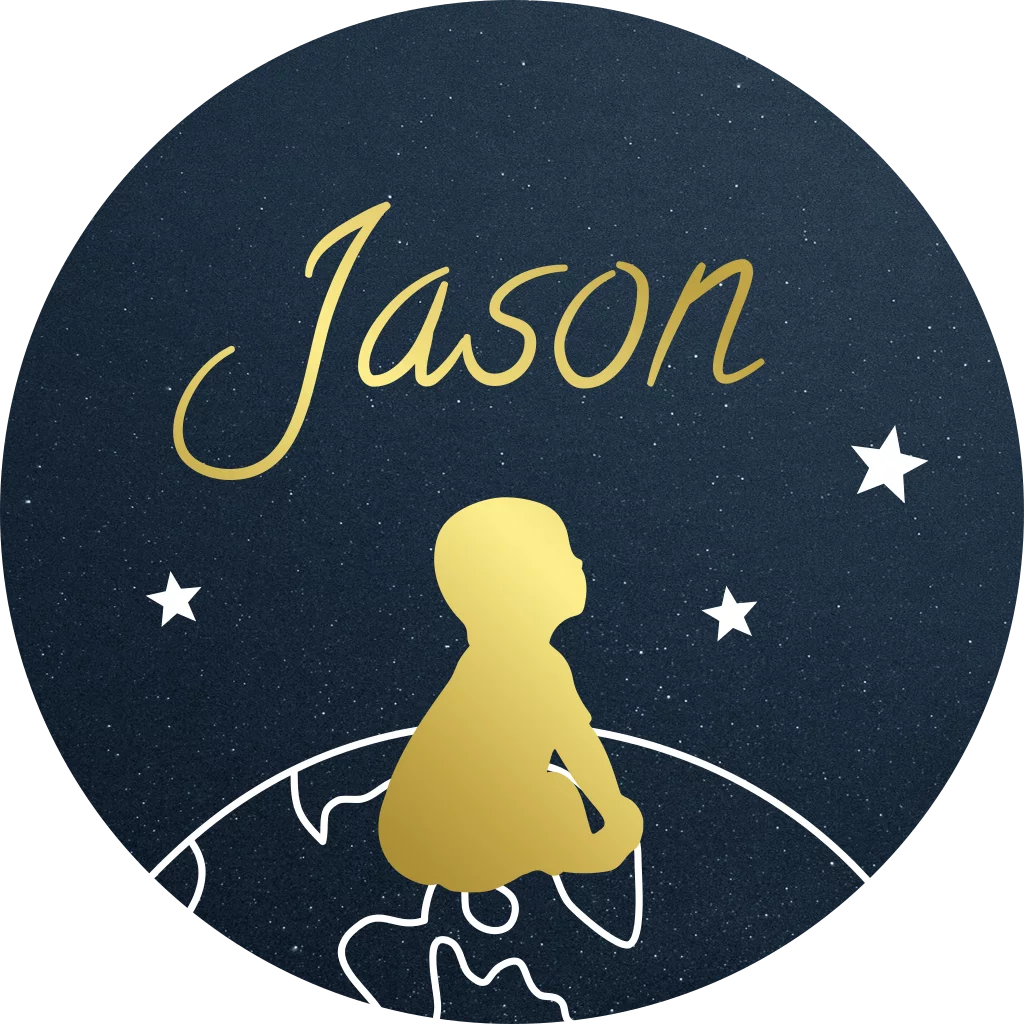 Donkerblauwe sluitsticker met wereldbol met silhouet kindje en de naam gedrukt in prachtig goudfolie. Deze sticker past bij dit geboortekaartje. Pas het ontwerp naar eigen smaak aan in onze handige editor.
