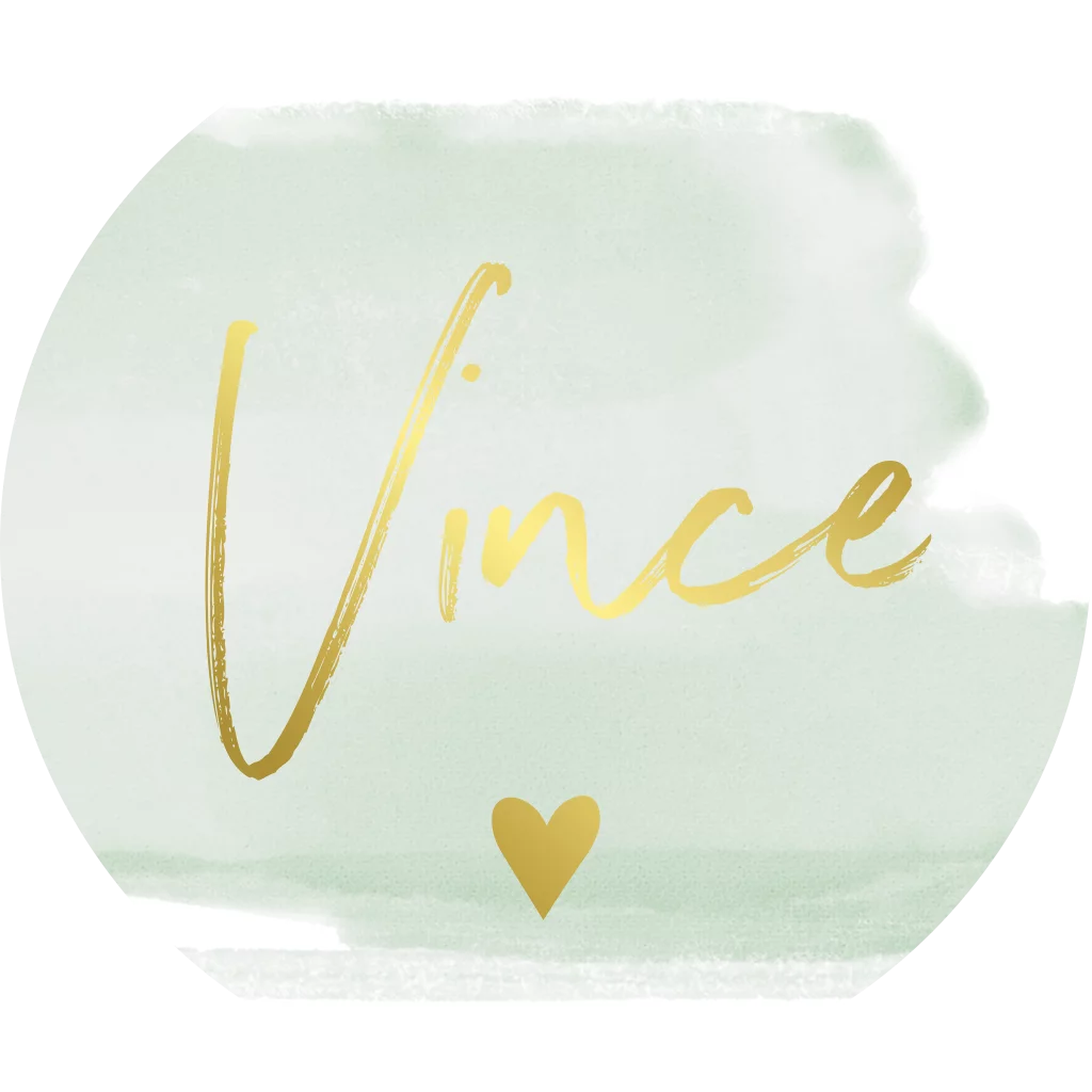 Stijlvol sluitsticker met de naam in goudfolie op een groene waterverf vlek en nog een goudfolie hartje. Pas de sticker naar wens aan met de editor.