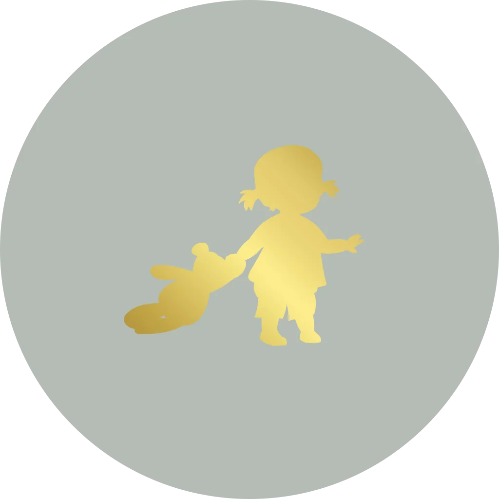 Zachtgroene sluitzegel met goudfolie silhouetje van meisje met teddybeer. Deze sticker past goed bij ons geboortekaartje 'Silhouet geboortekaartje meisje met knuffel in goudfolie'. Pas de sticker zelf aan in onze editor.