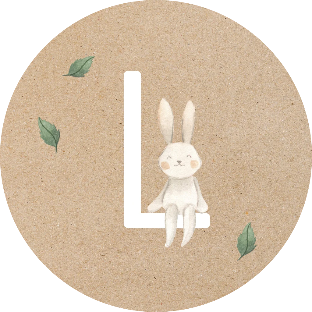 Leuke sluitzegel voor op de enveloppen van je geboortekaartjes. Op deze ronde sticker staat het initiaal van je kindje met daaromheen groene waterverf blaadjes. Bovenop zit een klein konijntje. Je kunt zelf eventueel andere dieren toevoegen met behulp van onze editor.