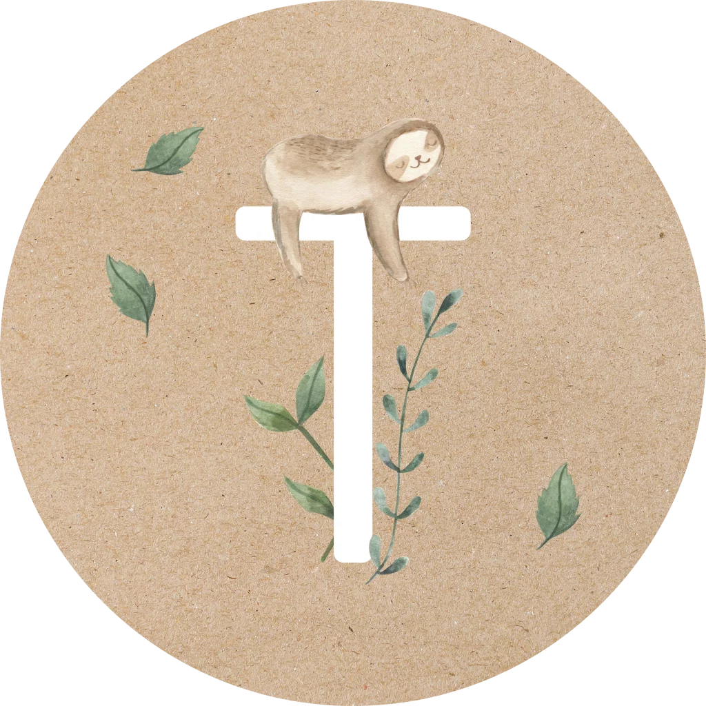Leuke sluitzegel voor op de enveloppen van je geboortekaartjes. Op deze ronde sticker staat het initiaal van je kindje met daaromheen groene waterverf blaadjes. Bovenop slaapt een kleine luiaard. Je kunt zelf eventueel andere dieren toevoegen met behulp van onze editor.