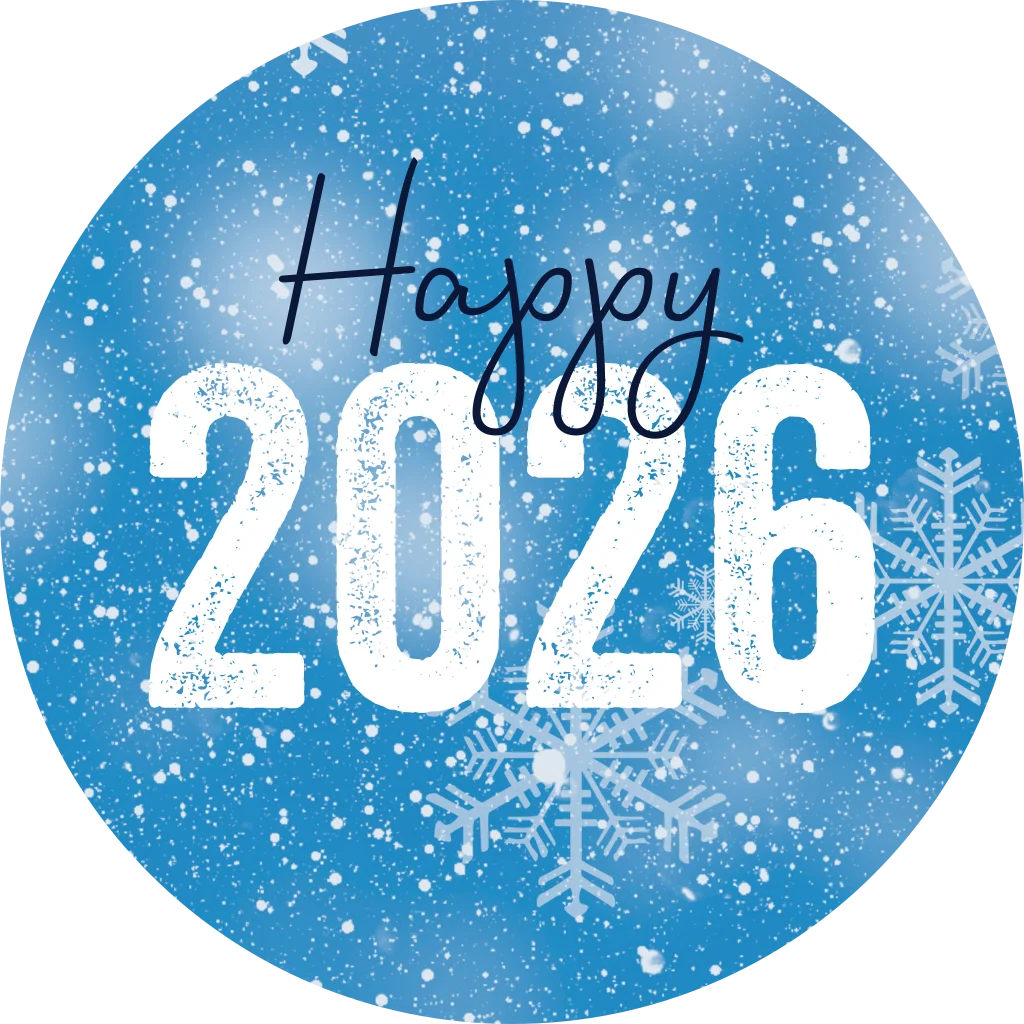 Plak je nieuwjaarskaarten dicht met deze sluitzegel met zachtblauwe ijssterren en daarop de tekst 'Happy 2026'. De tekst kun je naar wens aanpassen.