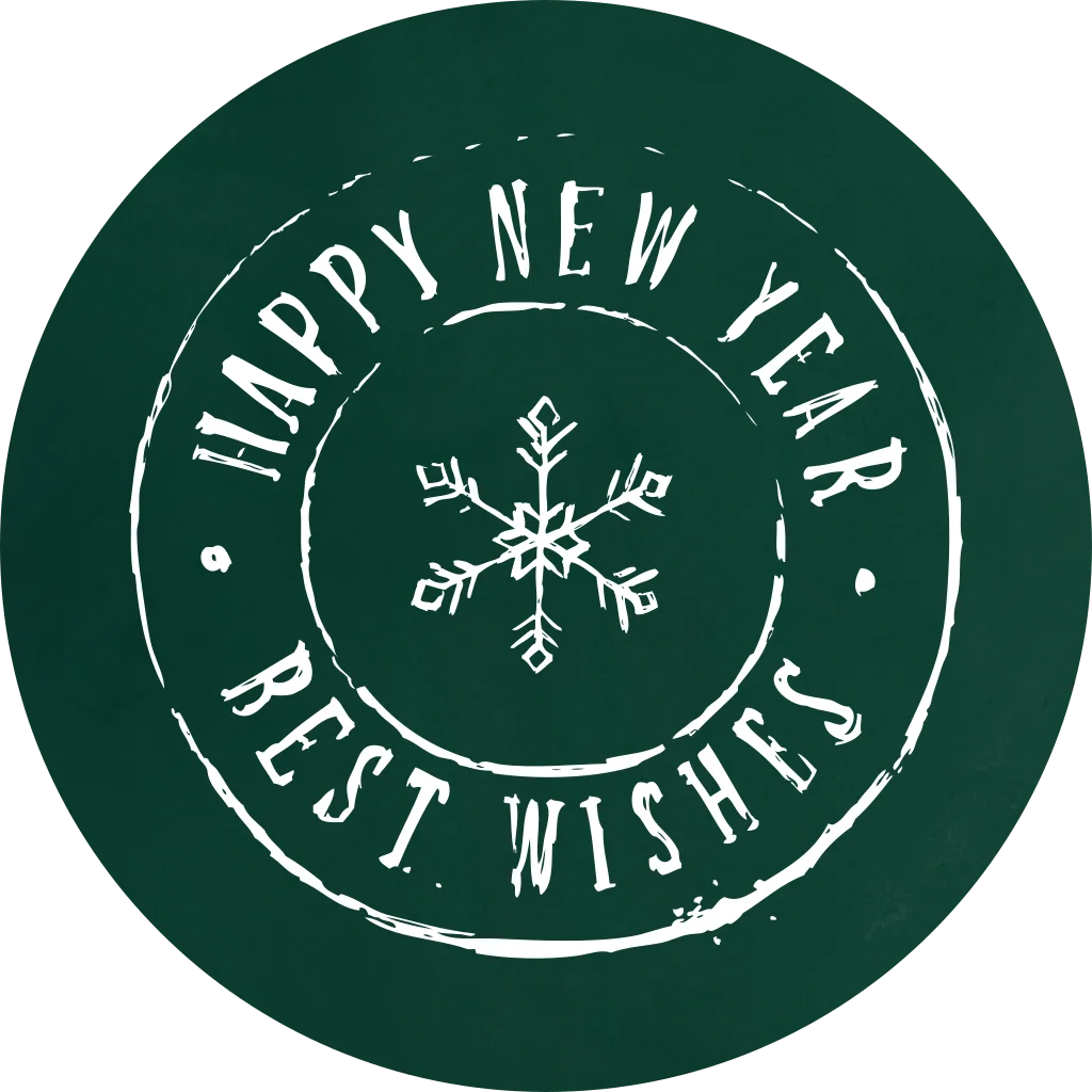 Donkergroene sluitzegel met een leuke illustratie van een witte stempel met het thema kerst. In het midden zie je een sneeuwvlok en de tekst 'Happy new year' en 'Best wishes'. Plak de sticker op de achterzijde van je envelop om de kerstkaart te verzegelen.