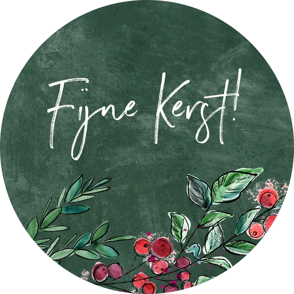 Donkergroene sluitsticker met botanische tekeningen en 'Fijne Kerst' in witte typografie. Pas dit ontwerp zelf aan in onze handige editor.