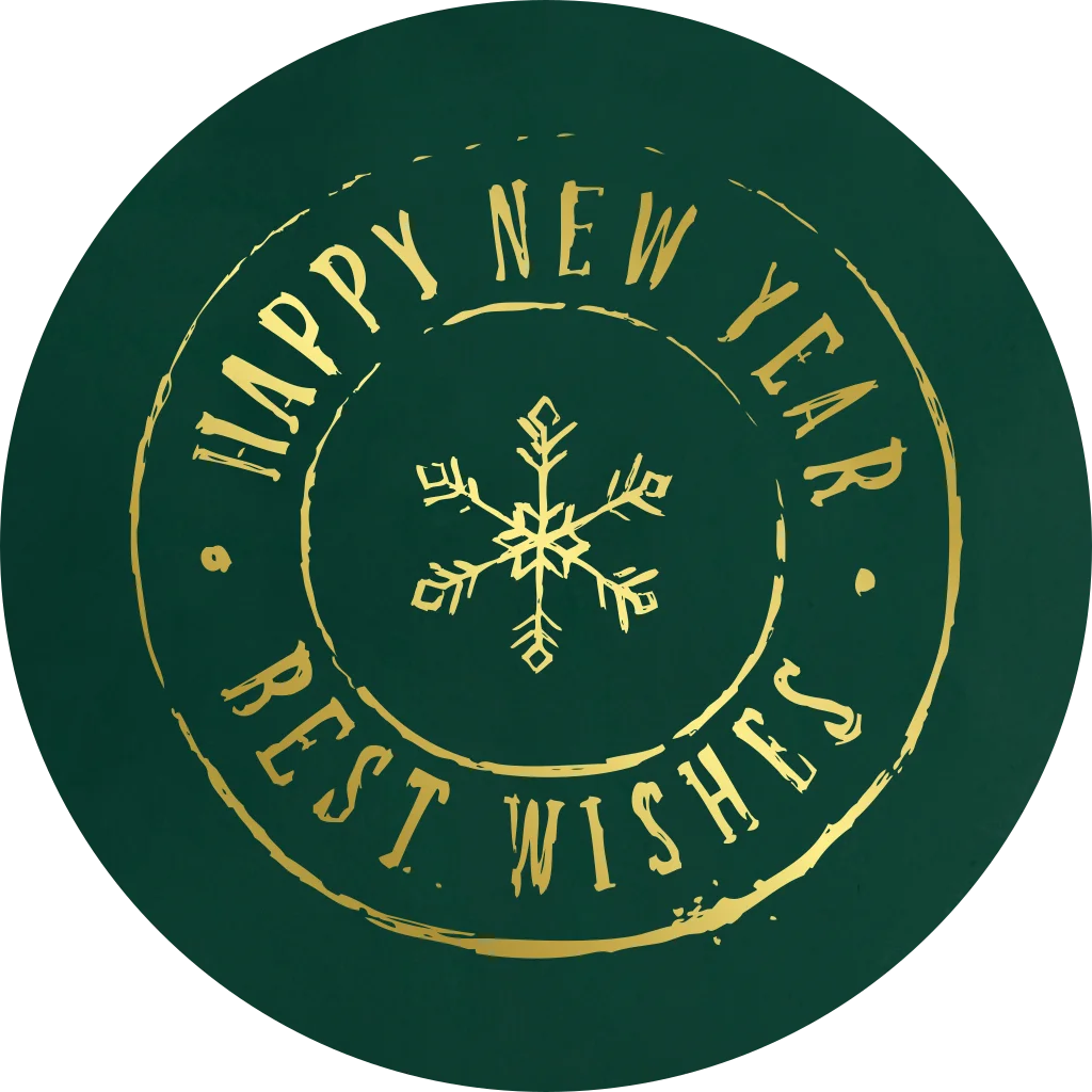 Donkergroene sluitzegel stempel met een sneeuwvlok en de tekst 'Happy new year' en 'Best wishes' in goudfolie. Plak de sticker op de achterzijde van je envelop om de kerstkaart te verzegelen.