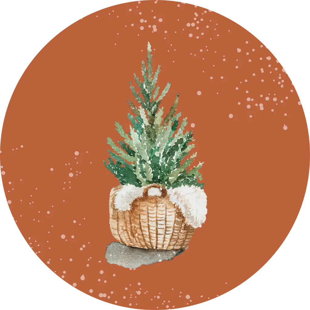 Roestbruine kerst sluitsticker met waterverf illustratie van een kerstboompje en witte spetters. Plak deze vrolijke sluitzegel op de enveloppen van je kerstkaarten om het geheel feestelijk te versturen.