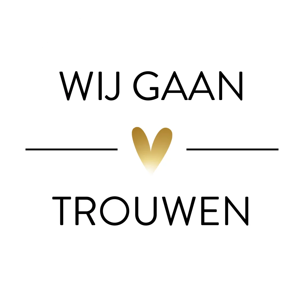 Witte sluitsticker met goudlook hartje en de tekst 'Wij gaan trouwen'. Pas de tekst naar wens aan met de editor. Let op! Dit is geen echte goudfolie.