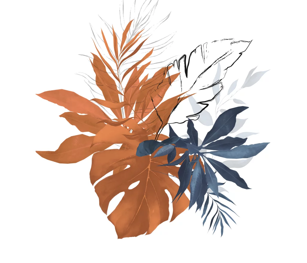 Hexagon sticker met blauwe en koperkleur bladeren