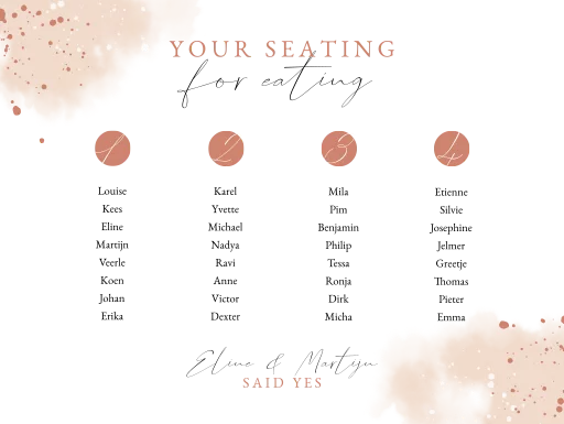 Heeft iedereen een vaste plek tijdens jullie huwelijksdiner? Plaats dit mooie bord met zachtroze waterverf en terra spetters op een prominente plek om dit aan iedereen te laten weten. Pas dit tafelschikking bord zelf aan in onze ontwerptool. Dit bord heeft een formaat van 73x55 cm.