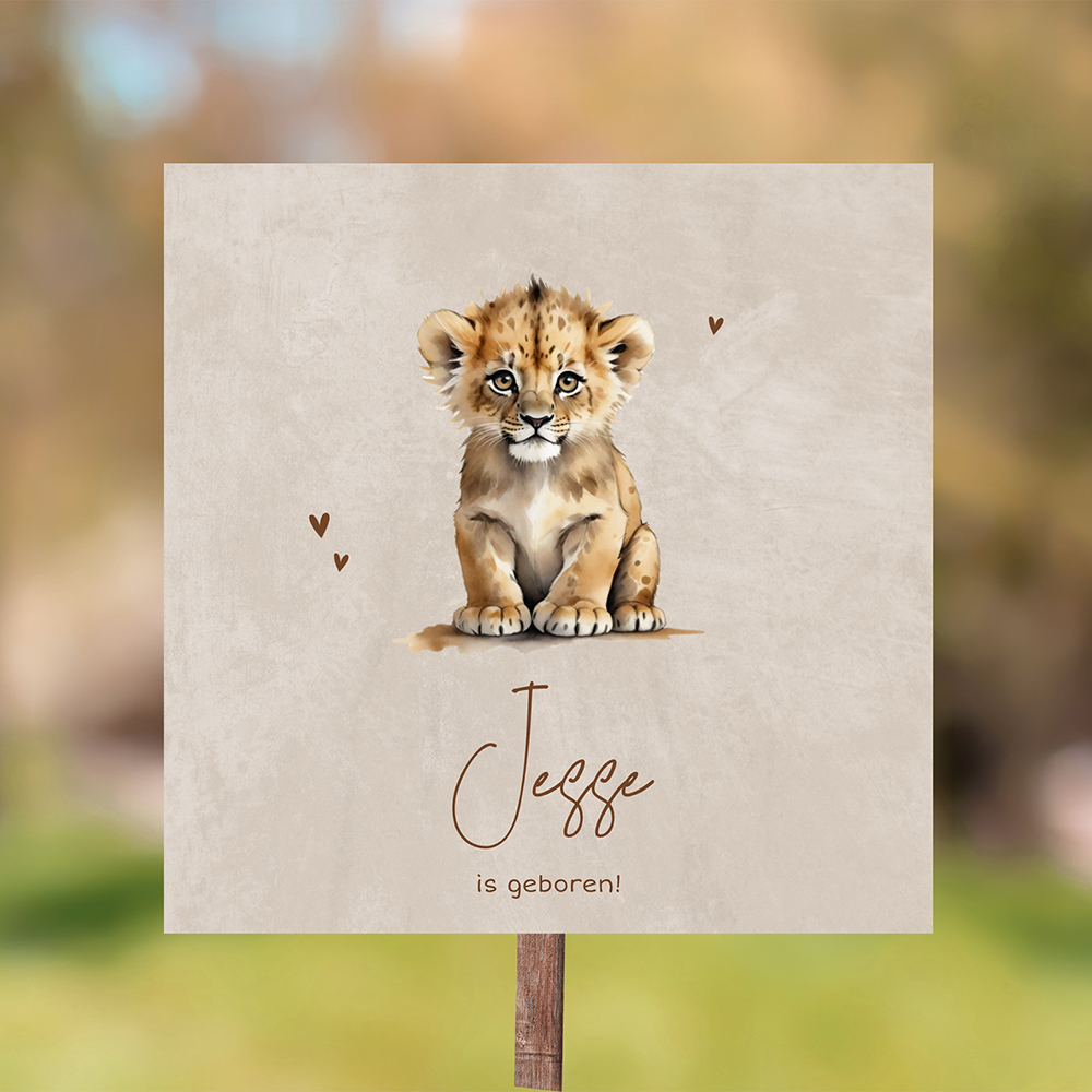Laat de buurt weten dat jullie zoon er is! Met dit stoere beige tuinbord, met een baby leeuw met hartjes en de naam, kondigen je vol trots de geboorte aan. Pas dit ontwerp zelf aan in onze handige editor. Dit bord voor in de tuin heeft een formaat van 70x70 cm. Heb je ons bijpassende geboortekaartje al gezien?