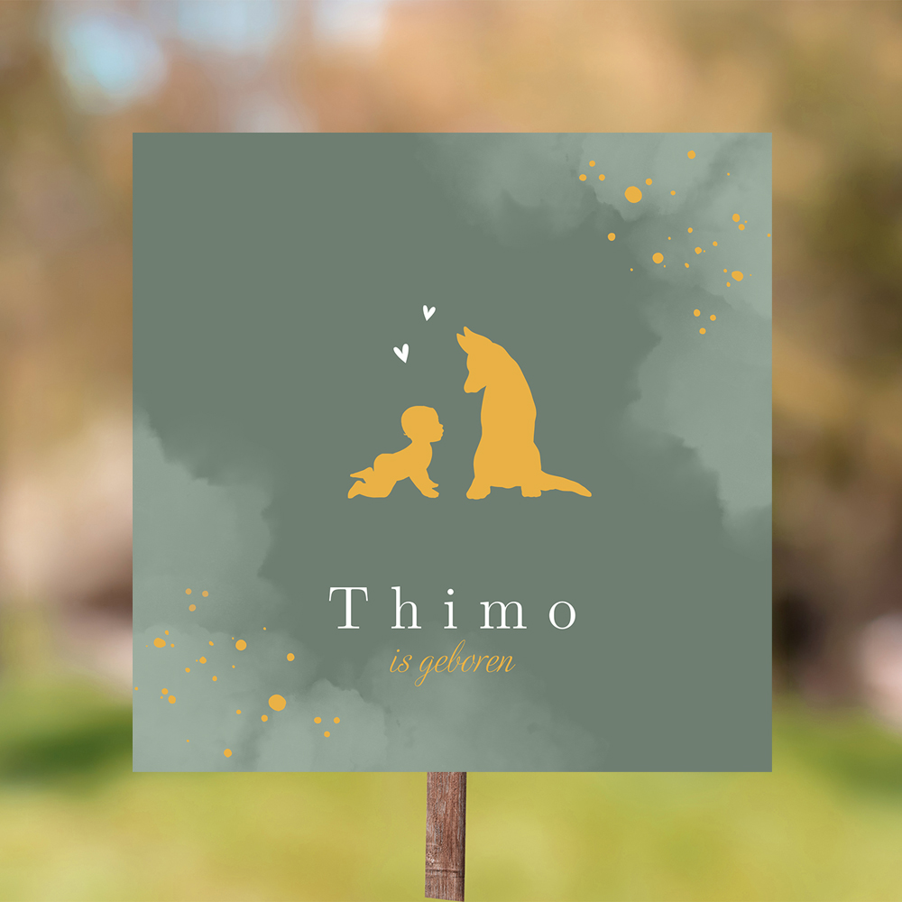 Kondig de geboorte van je zoon aan met dit leuke groene tuinbord van 70x70 cm met silhouetjes van een kruipende baby en hond. Pas zelf aan met de editor.