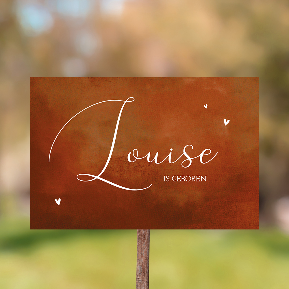 Hip roestbruin tuinbord welke perfect past bij het roestbruine geboortekaartje met code 0536-m. Dit bord heeft een formaat van 60x40 cm.