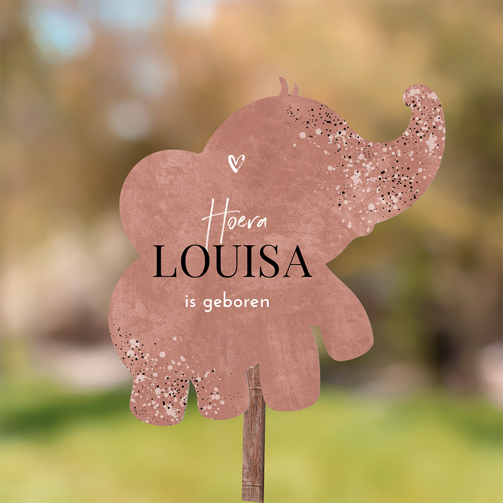 Verwelkom jullie dochtertje met dit lieve, roze tuinbord in de vorm van een olifant. Dit tuinbord past bij dit geboortekaartje.