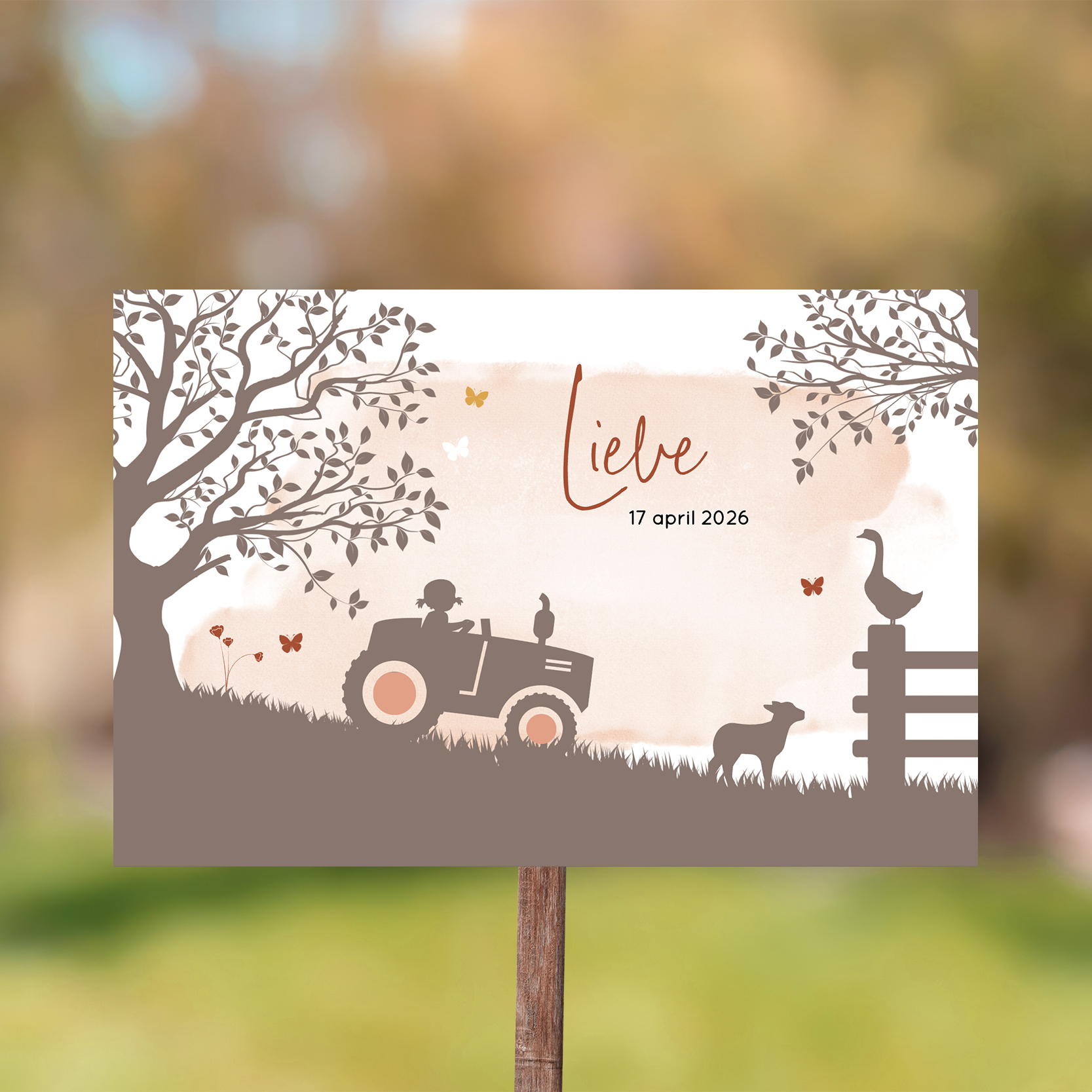Kondig de geboorte van je dochtertje aan met dit leuke tuinbord met bruin silhouet meisje op een tractor. Pas dit ontwerp zelf aan in onze handige editor. Dit bord voor in de tuin heeft een formaat van 60x40 cm.