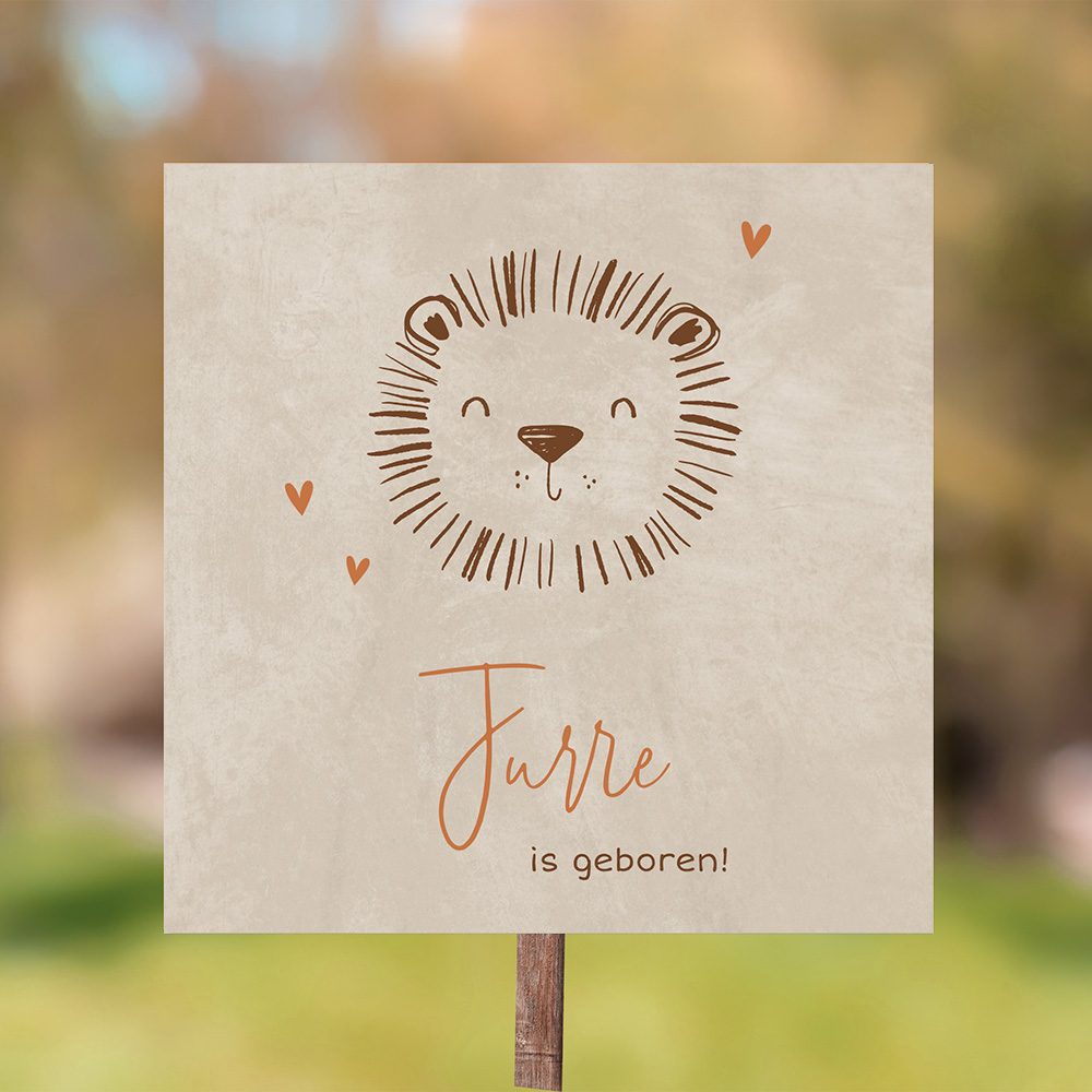 Verwelkom jullie zoon met dit stoere tuinbord met leeuw. Dit tuinbord past bij dit geboortekaartje.