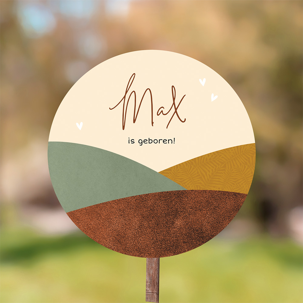 Verwelkom jullie zoontje met dit leuke tuinbord met minimalistische landschap. Dit tuinbord past bij dit geboortekaartje.