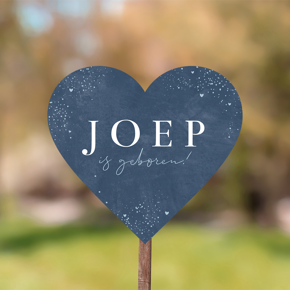 Origineel donkerblauw tuinbord in de vorm van een hart met lichtblauwe spetters en hartjes. Dit bord voor in de tuin wordt gesneden uit een formaat van ±80x80 cm.