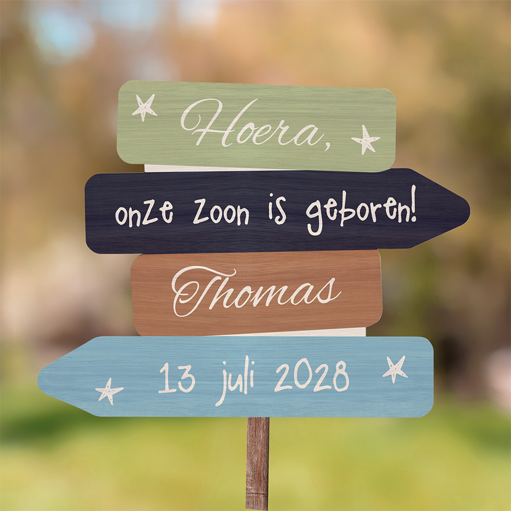 Verwelkom jullie zoontje met dit leuke tuinbord met gekleurde wegwijzers met tekst en icoontjes. De diverse teksten en kleuren kun je zelf aanpassen met onze handige online editor.