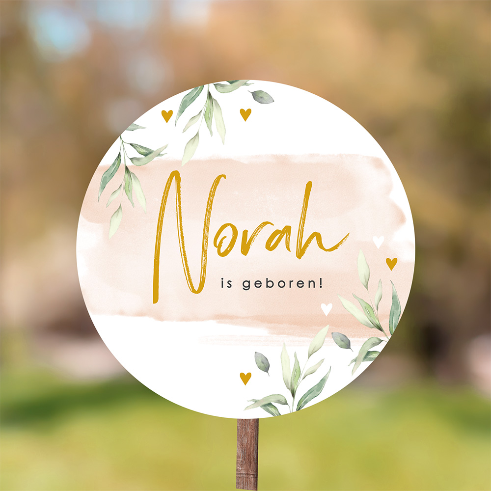 Verwelkom jullie dochter met dit ronde tuinbord met roze waterverf en blaadjes. Dit tuinbord past bij dit geboortekaartje.