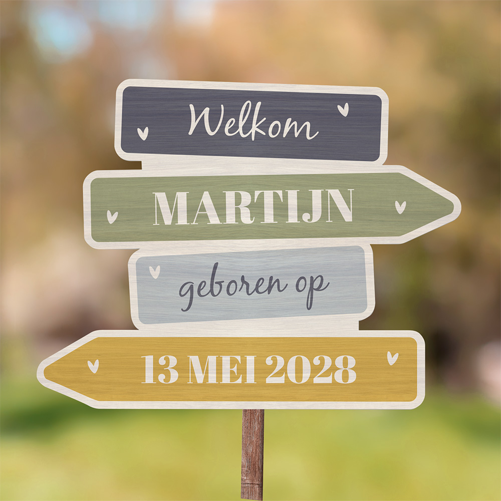 Laat de buurt weten dat jullie zoontje is geboren met dit leuke tuinbord met gekleurde wegwijzers. De diverse teksten en kleuren kun je zelf aanpassen met onze handige online editor.
