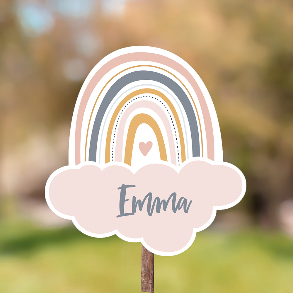 Maak de geboorte van jullie dochtertje bekend met dit stijlvolle tuinbord, gevormd als een regenboog achter een lieflijke wolk. Pas de naam aan en speel met de kleuren van de wolk en het hartje in onze gebruiksvriendelijke online editor.