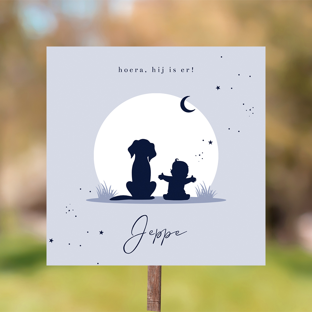 Kondig de geboorte van je zoontje aan met dit leuke tuinbord in zachtblauw. Een silhouet kindje zit naast een hond, ze kijken samen naar een zonsondergang. De maan en sterren staan al aan de hemel. Pas dit ontwerp zelf aan in onze handige editor. Dit bord voor in de tuin heeft een formaat van 70x70 cm. Heb je ons bijpassende geboortekaartje al gezien?
