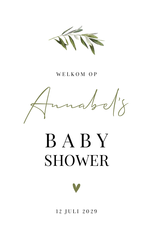 Een stijlvol welkomstbord voor de babyshower. Het bord heeft een groene olijftakje en is verder minimalistisch van opmaak. Ideaal voor een babyshower in botanische, landelijke of zomerse sfeer.