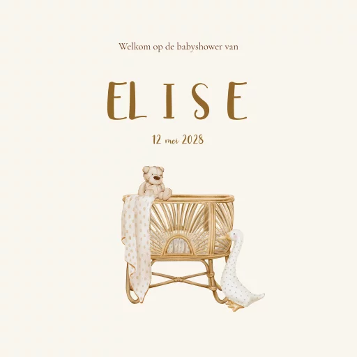 Een uniek en warm babyshowerbord met een illustratie van een rotan wiegje, een knuffelbeertje en een schattig gansje. De zachte kleuren en natuurlijke materialen geven het bord een rustige, stijlvolle uitstraling — perfect voor een babyshower in boho of vintage stijl.