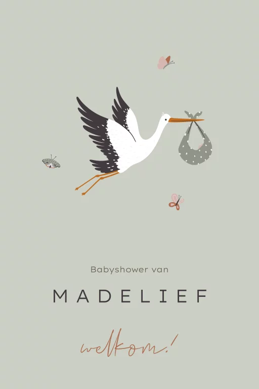 Een teder en vrolijk babyshowerbord met een illustratie van een ooievaar die een bundeltje draagt, omringd door fladderende vlinders. De zachtgroene achtergrond en warme aardetinten zorgen voor een natuurlijke, zachte uitstraling. Ideaal voor een babyshower met een liefdevolle en persoonlijke sfeer.