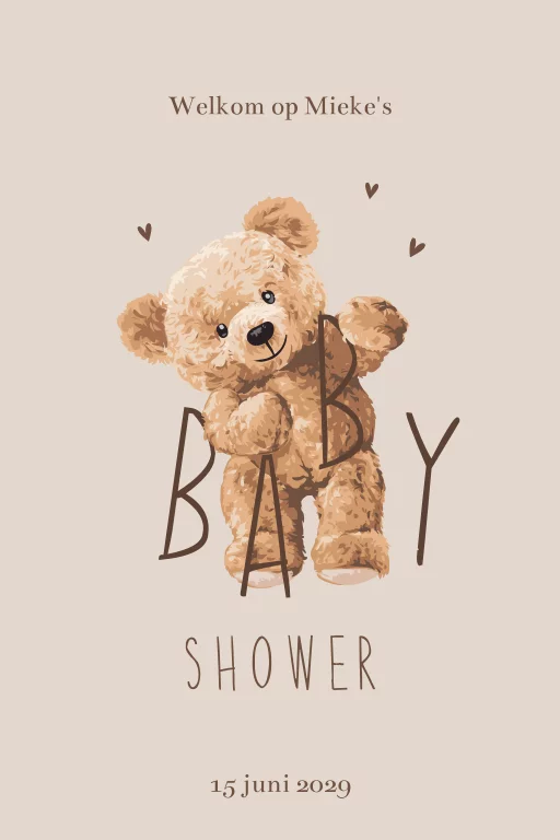 Dit vrolijke bord voor een babyshower met een teddybeer is perfect voor een feestelijke ontvangst. De speelse typografie, kleine hartjes en zachte beige achtergrond geven het ontwerp een warme uitstraling. Ideaal voor een neutrale of unisex babyshower. Open het design in de kaartenmodule en pas aan.