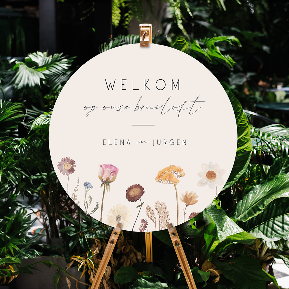 Welkomstbord in ronde vorm met wilde bloemen en strakke typografie (ø80 cm). Pas het bord naar wens aan met de editor.