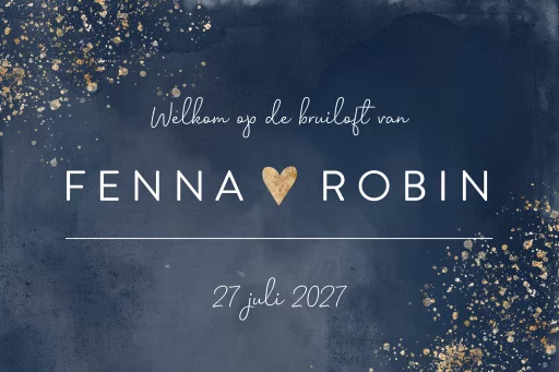 Mooi donkerblauw bruiloftsbord met goudkleurige spetters om jullie gasten welkom te heten op jullie huwelijk. Pas het bord naar wens aan met de editor.