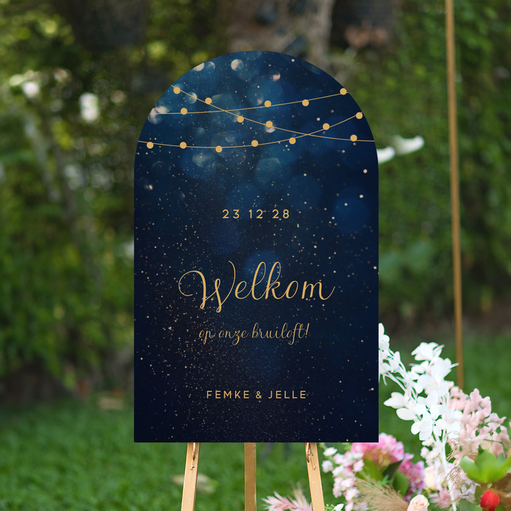 Mooi donkerblauw welkomstbord met okergele lampjes. Dit bruiloftsbord sluit perfect aan bij deze trouwkaart.