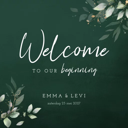 Prachtig, vierkant welkomstbord (70 x 70 cm) in donkergroene kleur met waterverf illustraties van bladeren. Pas dit bord zelf aan in onze handige ontwerptool.