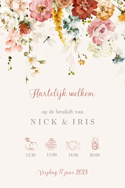 Romantisch programmabord helemaal in het teken van de lente / zomer met zijn kleurrijke waterverf bloemen. Het programma van de dag staat met leuke icoontjes weergegeven. Dit bruiloftsbord sluit perfect aan bij deze trouwkaart.