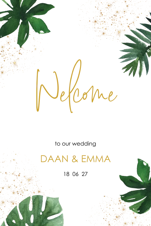 Tropisch welkomstbord (40 x 60 cm) met groene bladeren en goudlook spetters. Pas dit bord zelf aan in onze handige ontwerptool.