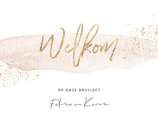 Klassiek liggend welkomstbord met blush waterverf veeg in roze en gouden spetters. Zo verwelkom je je gasten op een mooie manier. Pas het welkomstbord naar wens aan in de ontwerptool.