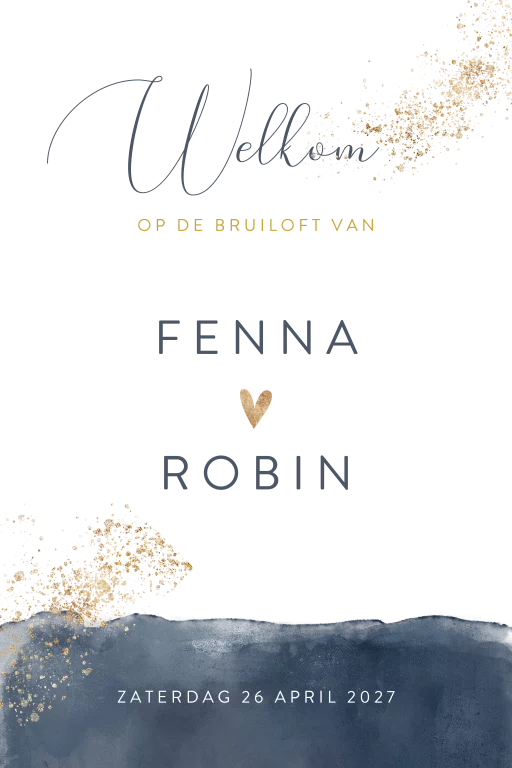 Welkomstbord met donkerblauwe waterverf en goudkleurige spetters. Bij dit welkomstbord hebben we een uitgebreide trouwhuisstijl zodat je al je trouwdrukwerk in dezelfde stijl kunt houden. Wel zo mooi! Pas het welkomstbord naar wens aan in de ontwerptool.