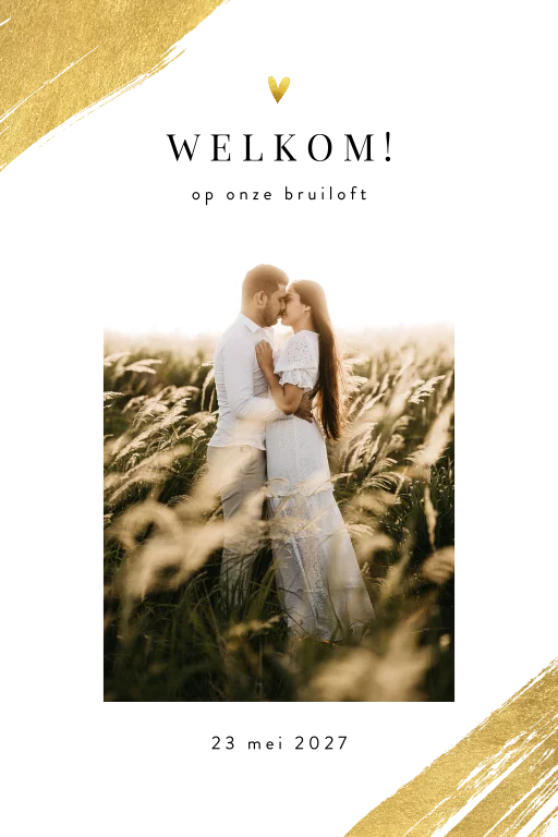 Klassiek staand welkomstbord met goudkleurige vegen, stijlvolle typografie en een prachtige foto van jullie samen. Zo heet je je gasten op een bijzondere manier welkom. Pas het welkomstbord naar wens aan in de ontwerptool.