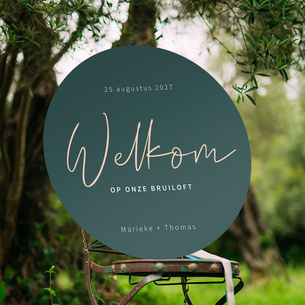 Rond zeegroen bruiloftsbord met ø80 cm. In stijlvolle typografie staat welkom in zachtroze. Foliedruk is niet mogelijk op dit bord. Pas het ontwerp naar wens aan.