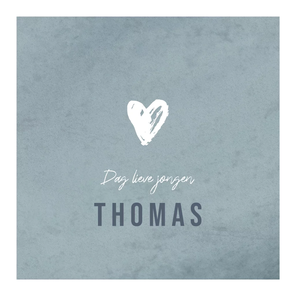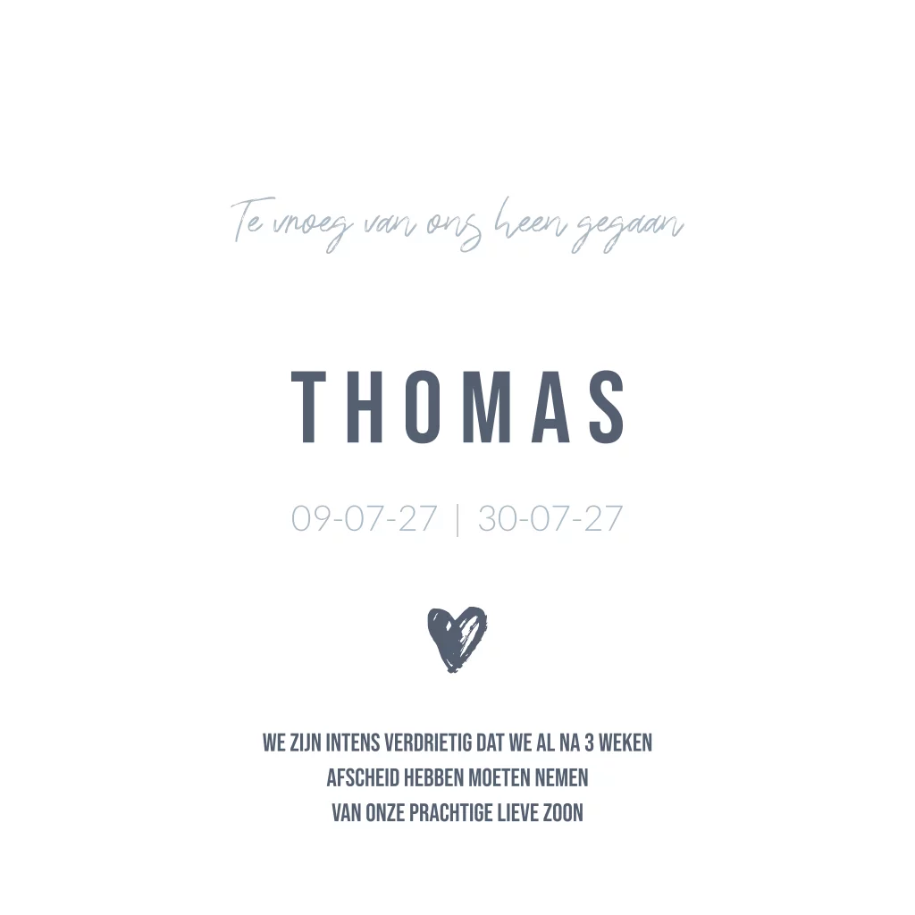Grijsblauw baby rouwkaartje met wit hartje voor het verlies van een jongen. Mooi stijlvol rouwkaartje om het afscheid van jullie zoontje aan familie en andere kennissen kenbaar te maken. Zachte waterverf achtergrond in grijs/blauw met een wit kader. Je kunt zelf alle teksten aanpassen. Heb je hulp nodig? Wij helpen je graag, dus bel of mail ons indien nodig.