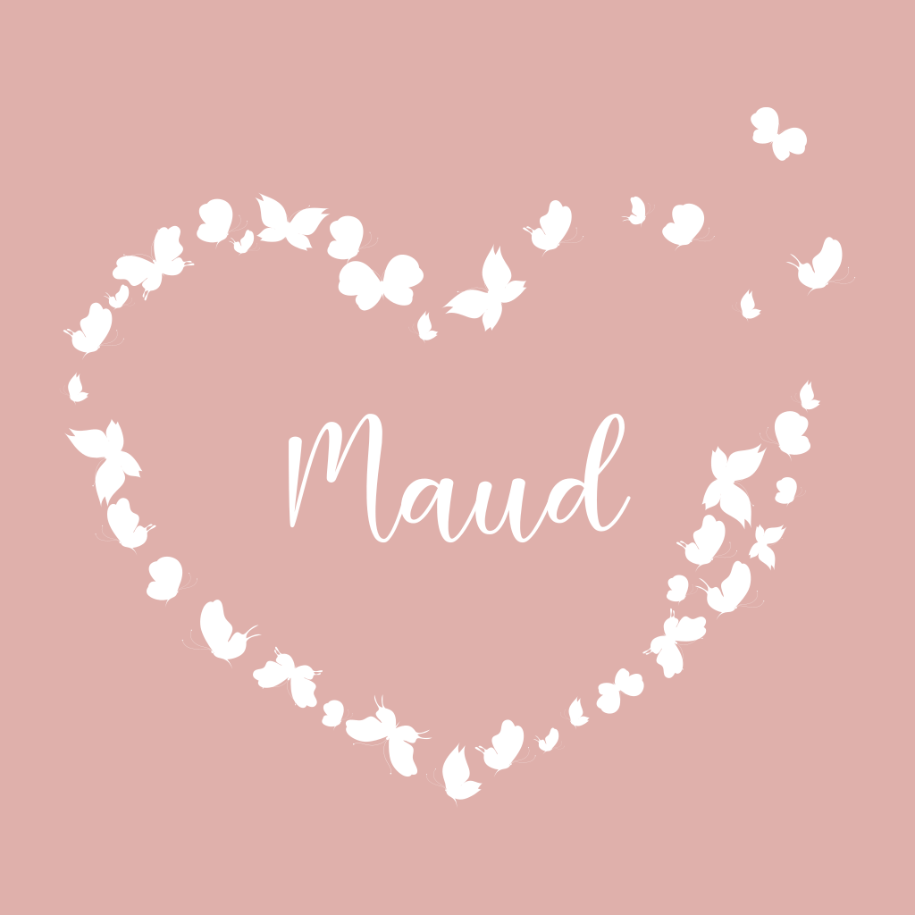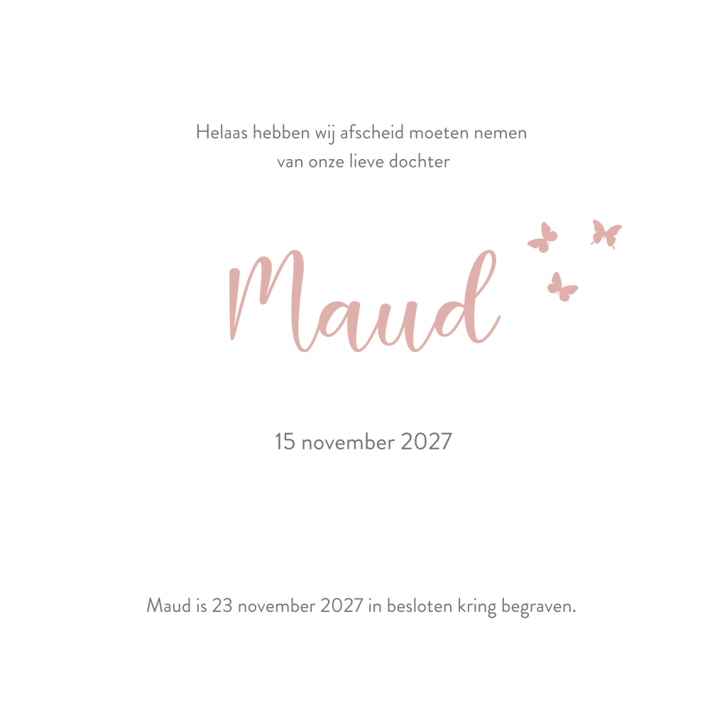 Rouwkaartje voor het verlies van een dochter met een illustratie van een hart gevormd door een allemaal verschillende vlinders. In de hoek vliegen een aantal vlindertjes omhoog en in het midden staat de naam. De overige tekst kun je aan de binnenzijde van de kaart plaatsen.