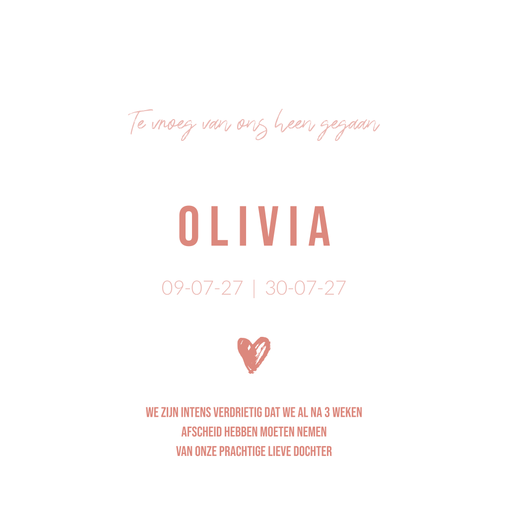 Zachtroze meisjes baby rouwkaartje met wit hartje. Mooi, stijlvol rouwkaartje om aan familie, vrienden en andere kennissen te sturen om het afscheid van jullie dochtertje te delen. Deze kaart heeft een zachtroze achtergrond. Je kunt zelf alle teksten aanpassen. Heb je hulp nodig, schroom dan niet ons te bellen of mailen indien nodig.