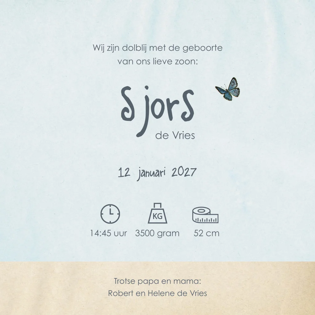 Op zoek naar een retro geboortekaartje voor je pasgeboren zoontje? Met dit lieve ontwerp met zachtblauwe achtergrond en witte stippen zit je altijd goed. Voorop staat een hertje en een blauwe vlinder onder een grote boom. Maak de kaart helemaal naar wens in onze gemakkelijke ontwerptool.