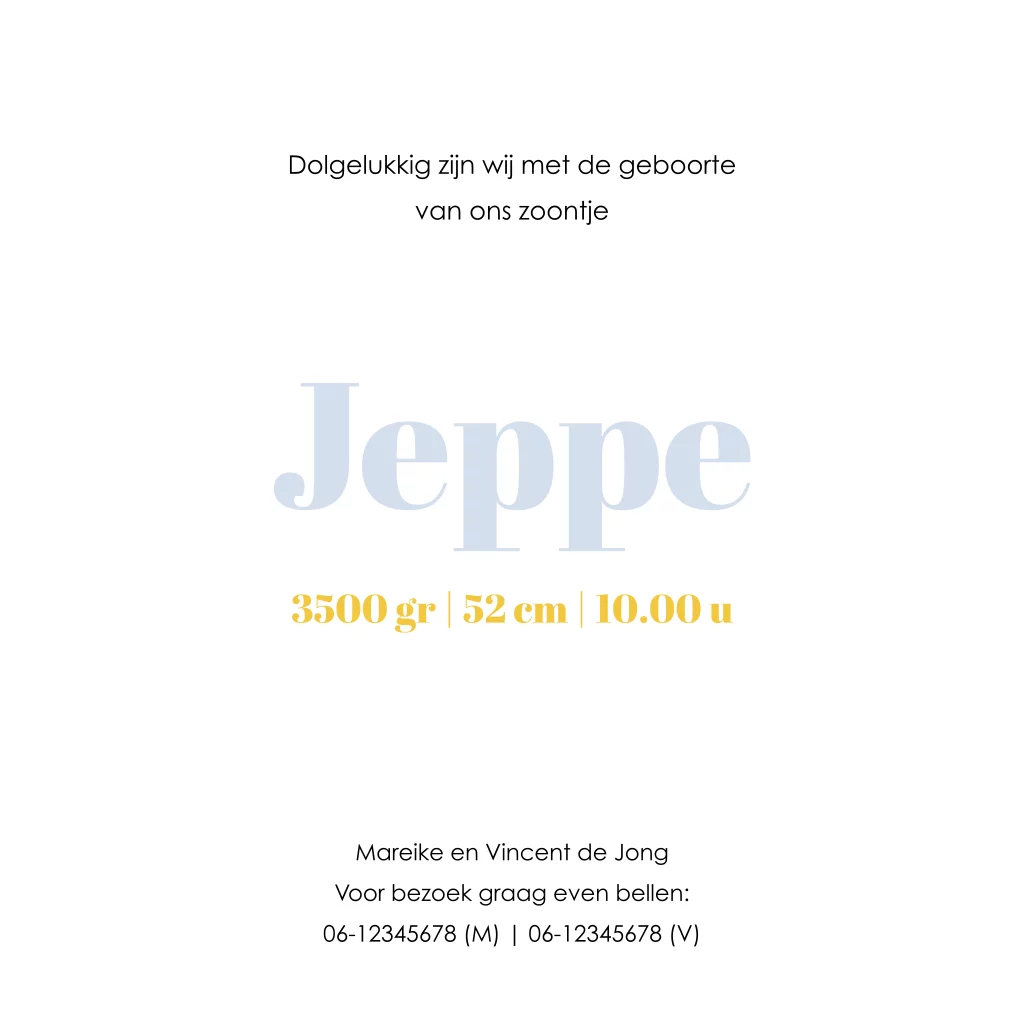 Een vrolijk geboortekaartje in zachtblauwe kleur met retro thema: een gele Mini Clubman staat groot voorop en loopt op de achterkant van de kaart door. Aan de binnenkant komt de vintage wagen terug met daaronder een leuke quote. Pas dit kaartje verder naar eigen smaak aan in onze ontwerptool.