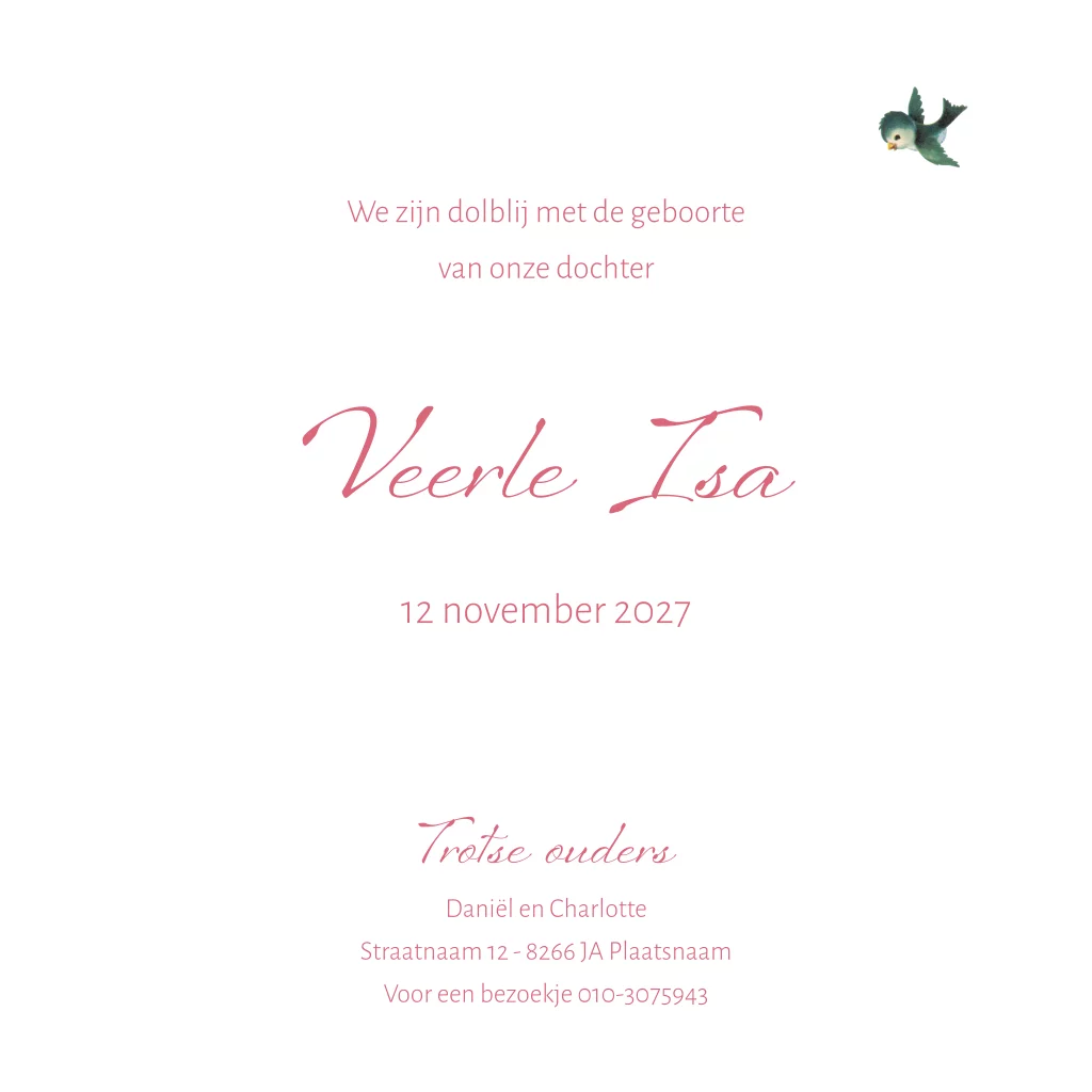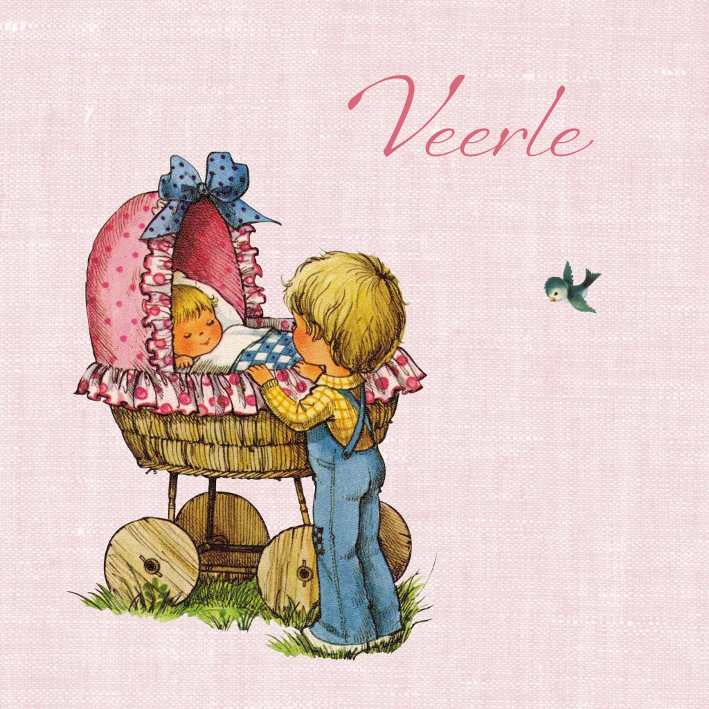 Retro geboortekaartje voor de geboorte van een 2e kindje met ouder broertje dat in het wiegje van zijn pasgeboren zusje kijkt. De teksten kun je zelf aanpassen.