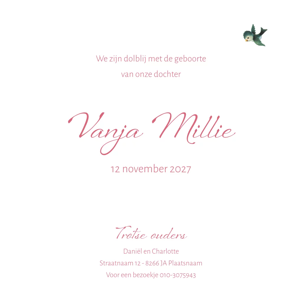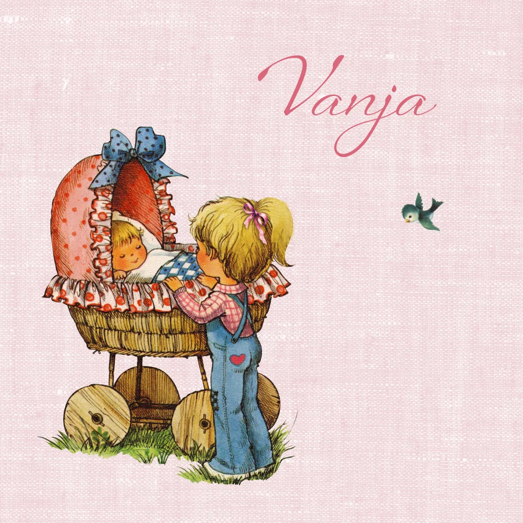 Retro geboortekaartje voor een 2e kindje met grote zus die in het wiegje van haar pasgeboren zusje kijkt. Pas de kaart zelf aan met de ontwerptool.