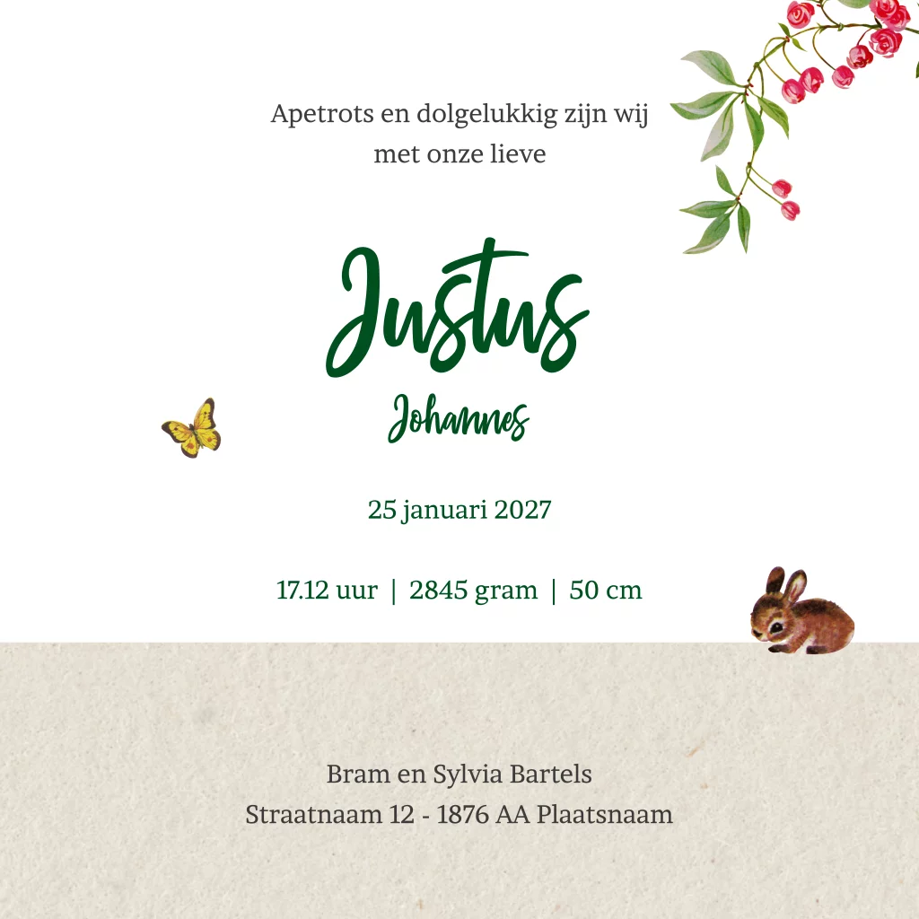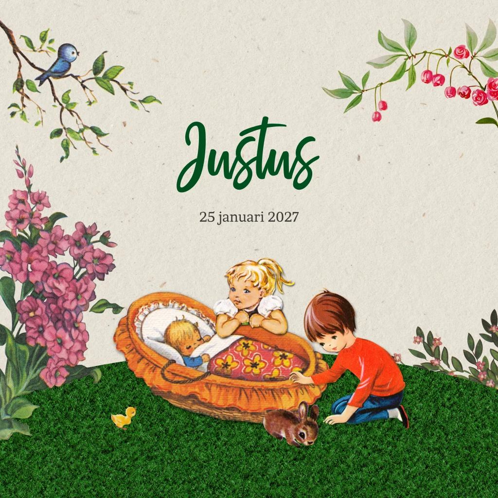 Schattig geboortekaartje voor een derde kindje. De grote broer en zus kijken bij het wiegje naar hun pasgeboren kleine broertje. Het wiegje staat in het grags omgeven door vrolijke bloemen en diertjes.Pas zelf teksten en kleuren aan of voeg illustraties toe.